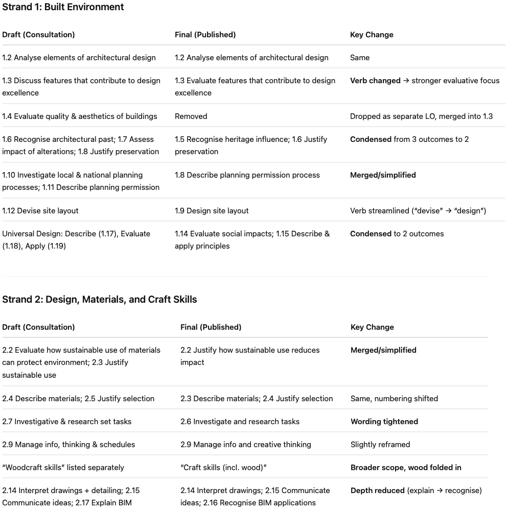 Here’s a strand-by-strand side-by-side table showing the main changes in learning outcomes between the Draft (Feb 2025) and the Final (Aug 2025). As you can see the changes involved a Simplification & condensation of outcomes, more consistent use of action verbs (evaluate, illustrate, design), a broader/global framing in rationale & aims, some improvements in relation to modernisation (MMC, updated standards, safety terminology) and some clarification around assessment with additionalemphasis on integrity.